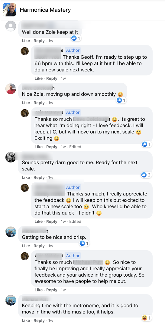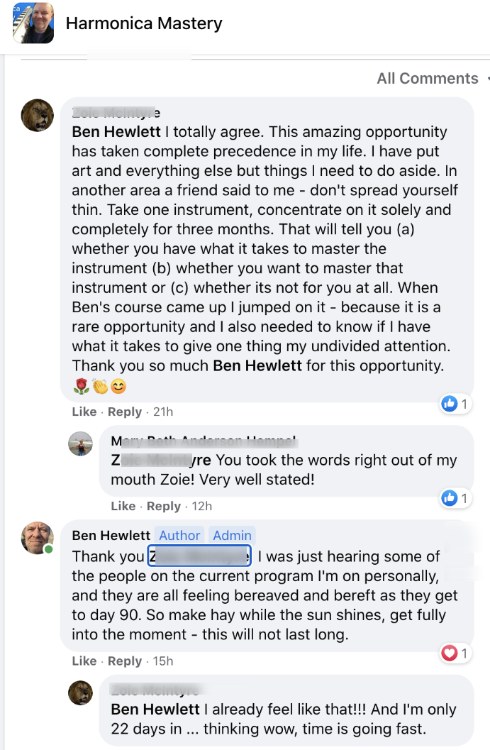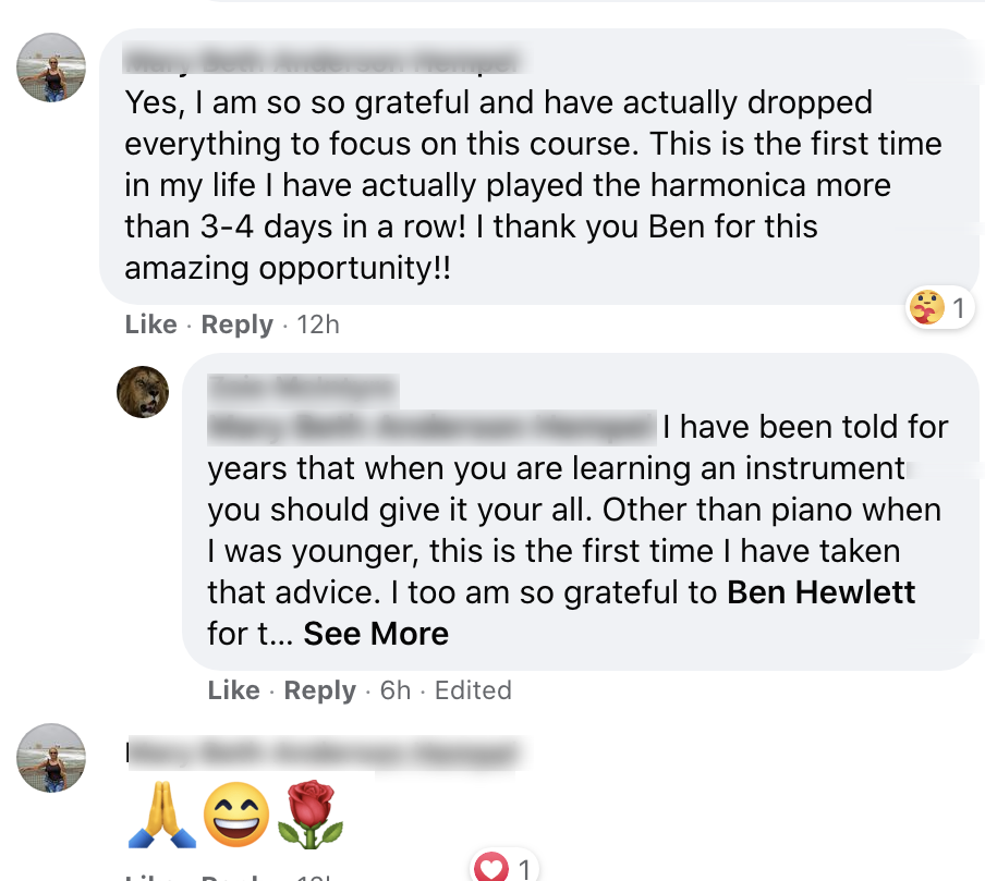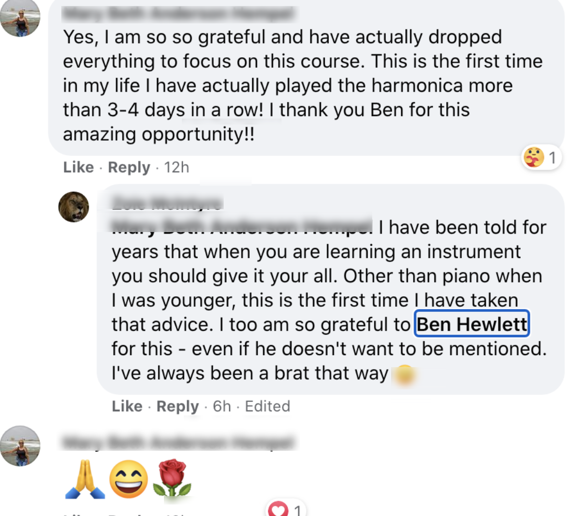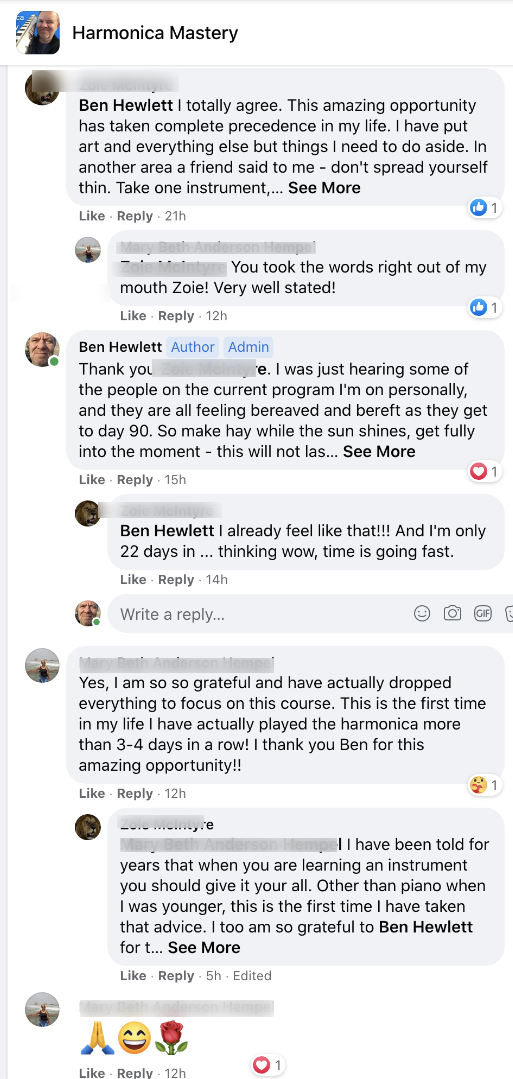 - Daily coaching/support in the private Facebook group - this is your new harmonica tribe/family, they will take care of you! (and kick your butt if you don't shape up!)
