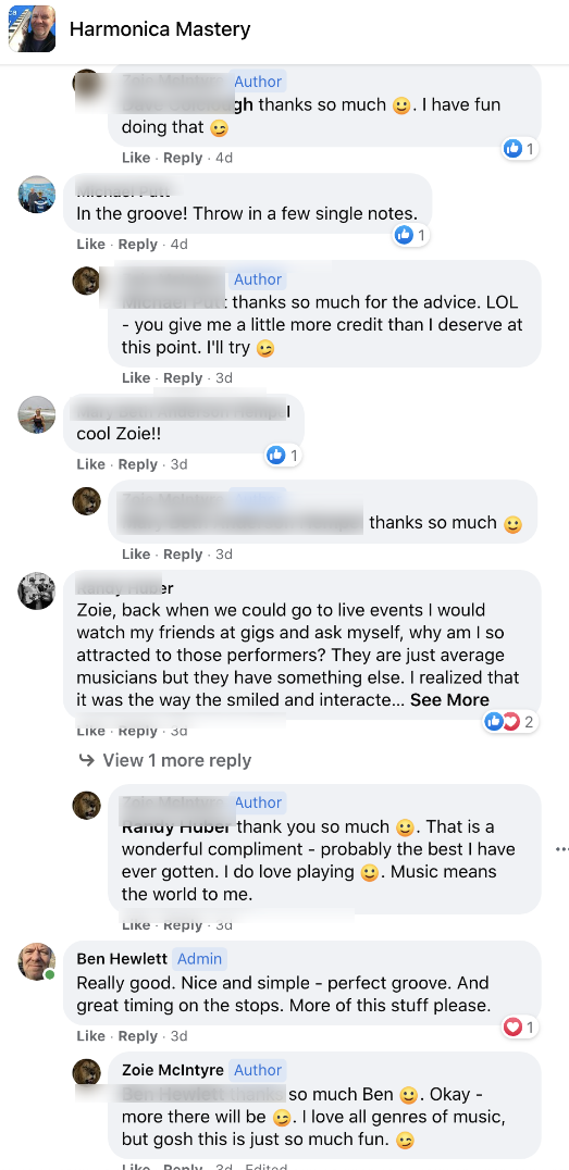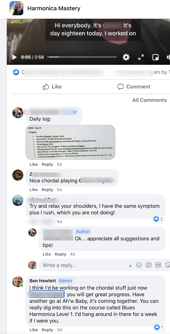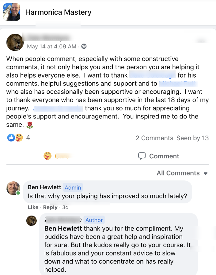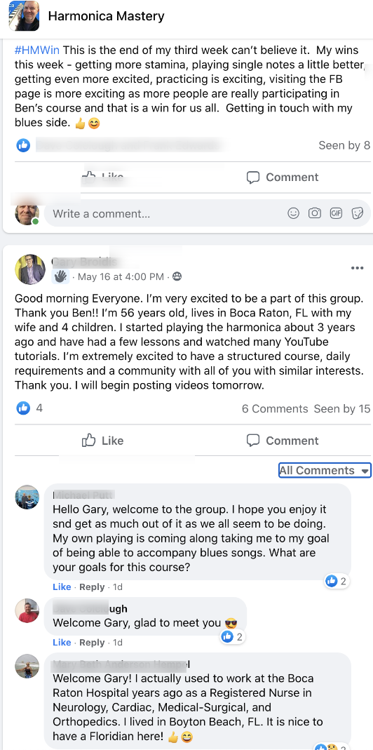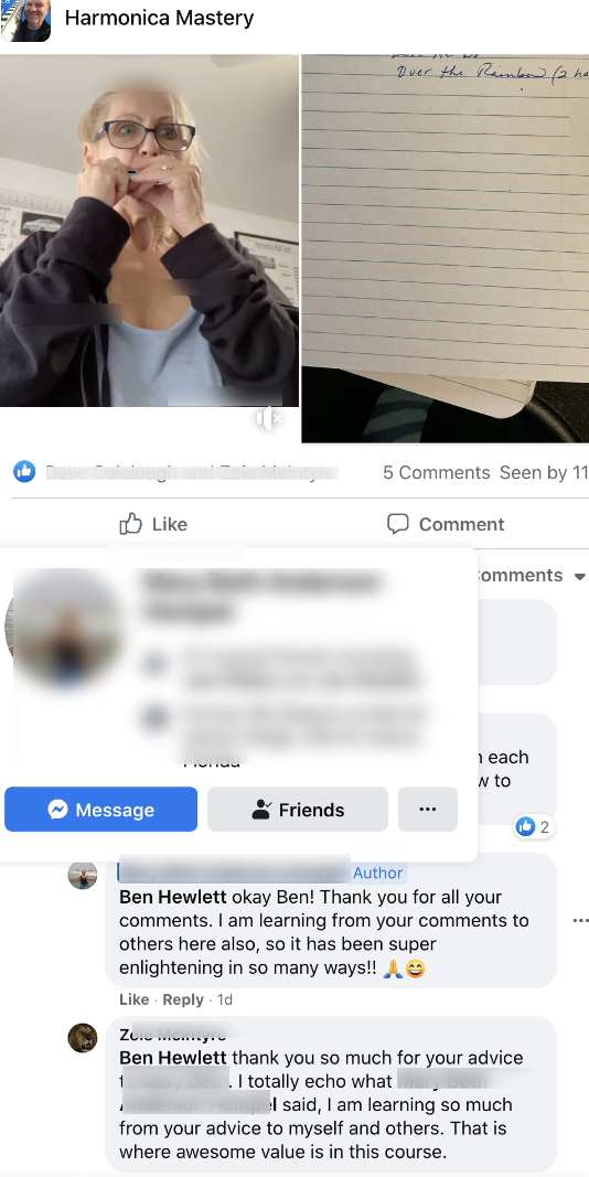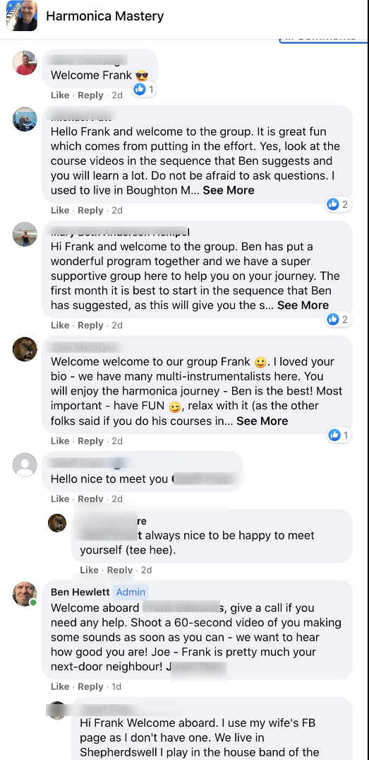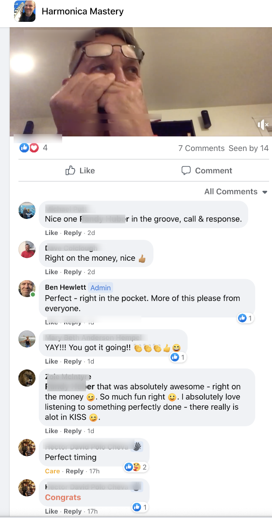 - Daily coaching/support in the private Facebook group - this is your new harmonica tribe/family, they will take care of you! (and kick your butt if you don't shape up!)