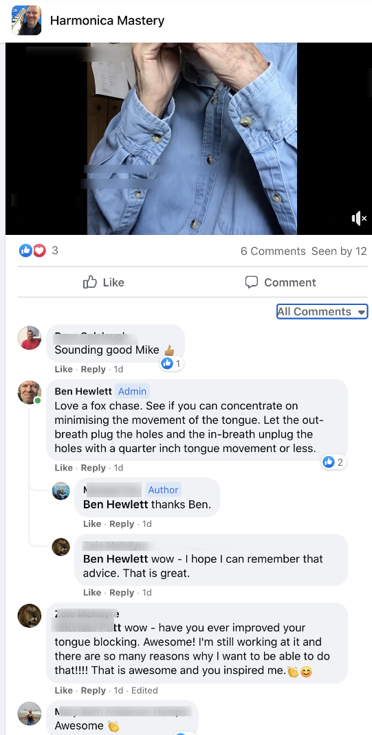 *Guaranteed success or your money back. Provided you can prove you have carried out everything as stated in the agreement, and you have spent at least 90 hours studying harmonica, you have submitted one video to the FB group every day, you have attended the live sessions and masterclasses, you've attended and played at the open mics, and have still made no progress within six months of joining, it clearly wasn't a good fit for you and you can request a full refund.